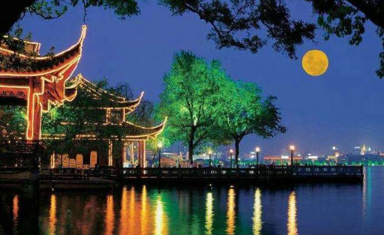 平湖秋月是西湖十景之一,但与其他景点不同之处在于它并无固定景点位置。每当秋高气爽的天气,西湖湖面平静如镜,皓洁的秋月当空,月光与湖水交相辉映,颇有“一色湖光万顷秋”之感,所以命名为“平湖秋月”。人们泛舟西湖之上,随处可浏览秋月美景。